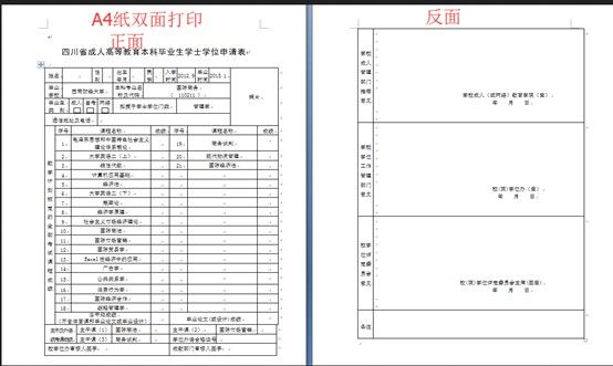 (二)完成网上信息申报后,学院将在2个工作日内进行初审,学生须及时关注,审核未通过的须按页面提示信息在申请时限内修改后再次提交,直至审核通过。审核通过的学生方可打印《基本信息登记表》和《四川省成人高等教育本科毕业生学士学位申请表》(以下简称学位申请表)。《学位申请表》为正反两面,须按打印设置要求使用A4纸双面打印如图: