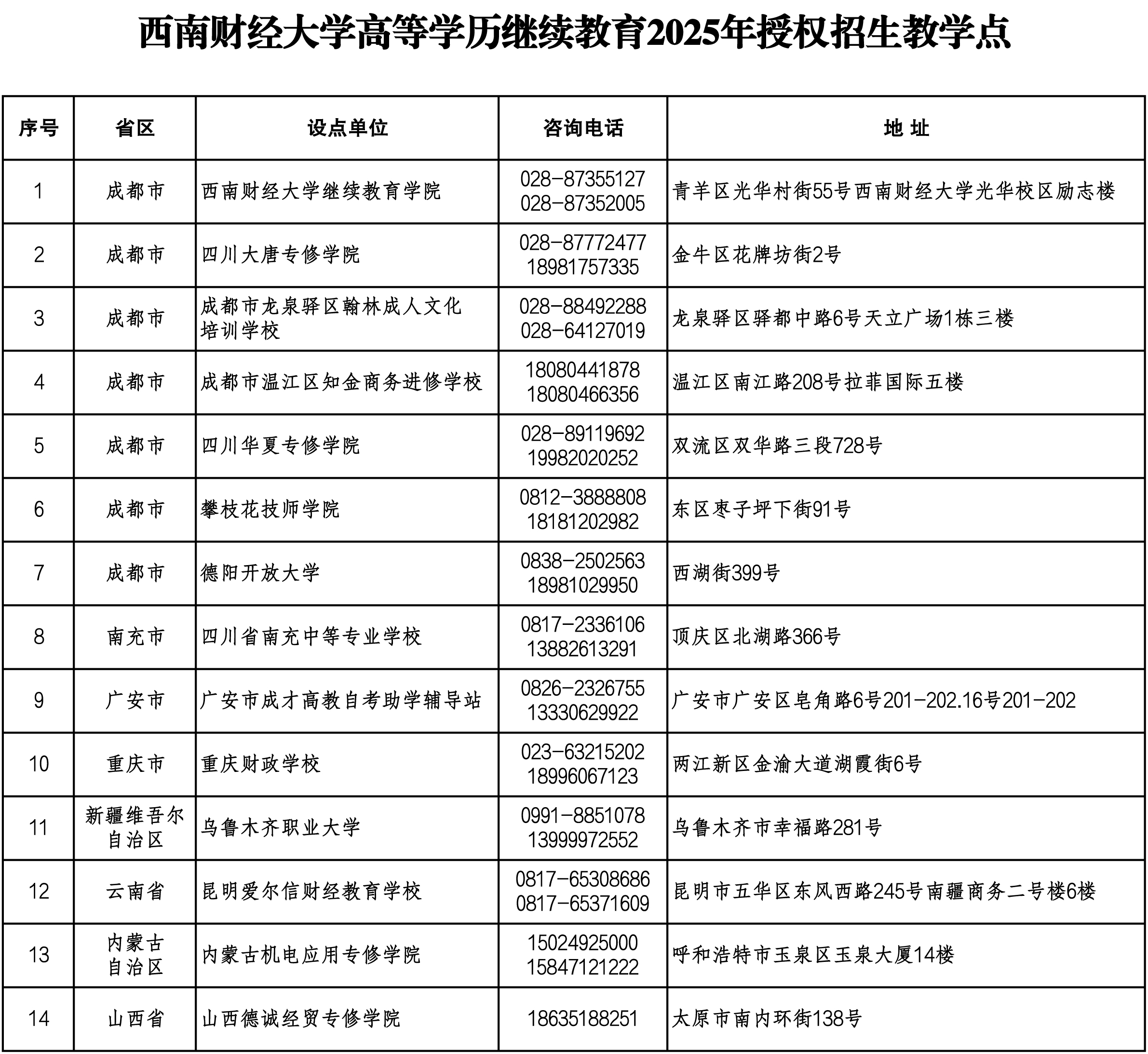 西南财经大学高等学历继续教育校本部和授权招生校外教学点