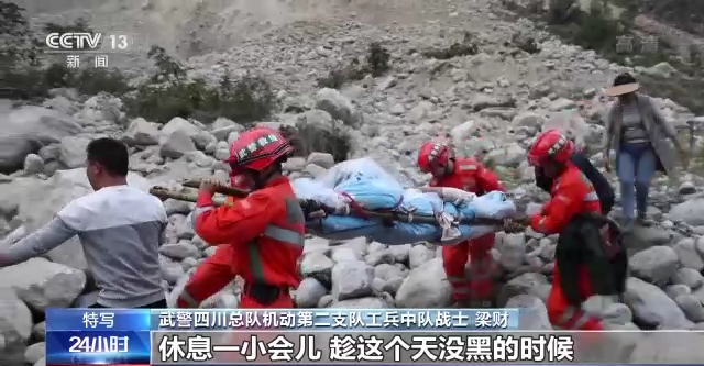武警四川总队机动第二支队工兵中队战士 梁财:运送的伤员中有腰受伤的、腿骨折的,我们休息的时候也只能找个平坦的地方,休息一小会儿,趁天没黑的时候,看得清路,抓紧时间往山上运,特别是运送至山上的时候,坡度比较大,滚石也比较多,很危险。但是战友们没有一个人喊苦喊累,都在坚持。