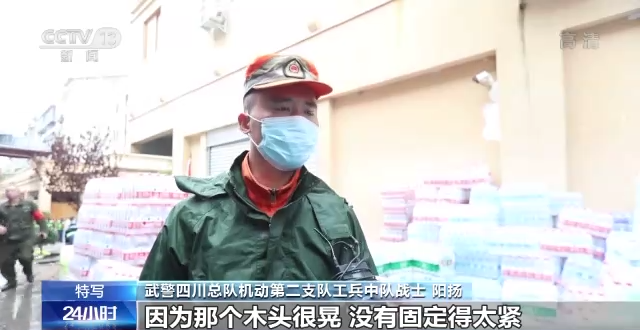 武警四川总队机动第二支队工兵中队战士 付小鹏:找村民借了摩托锯,割了木头,然后我们就想到那边有个大石头,搭建过去。然后我就利用这个绳索把木头捆住。